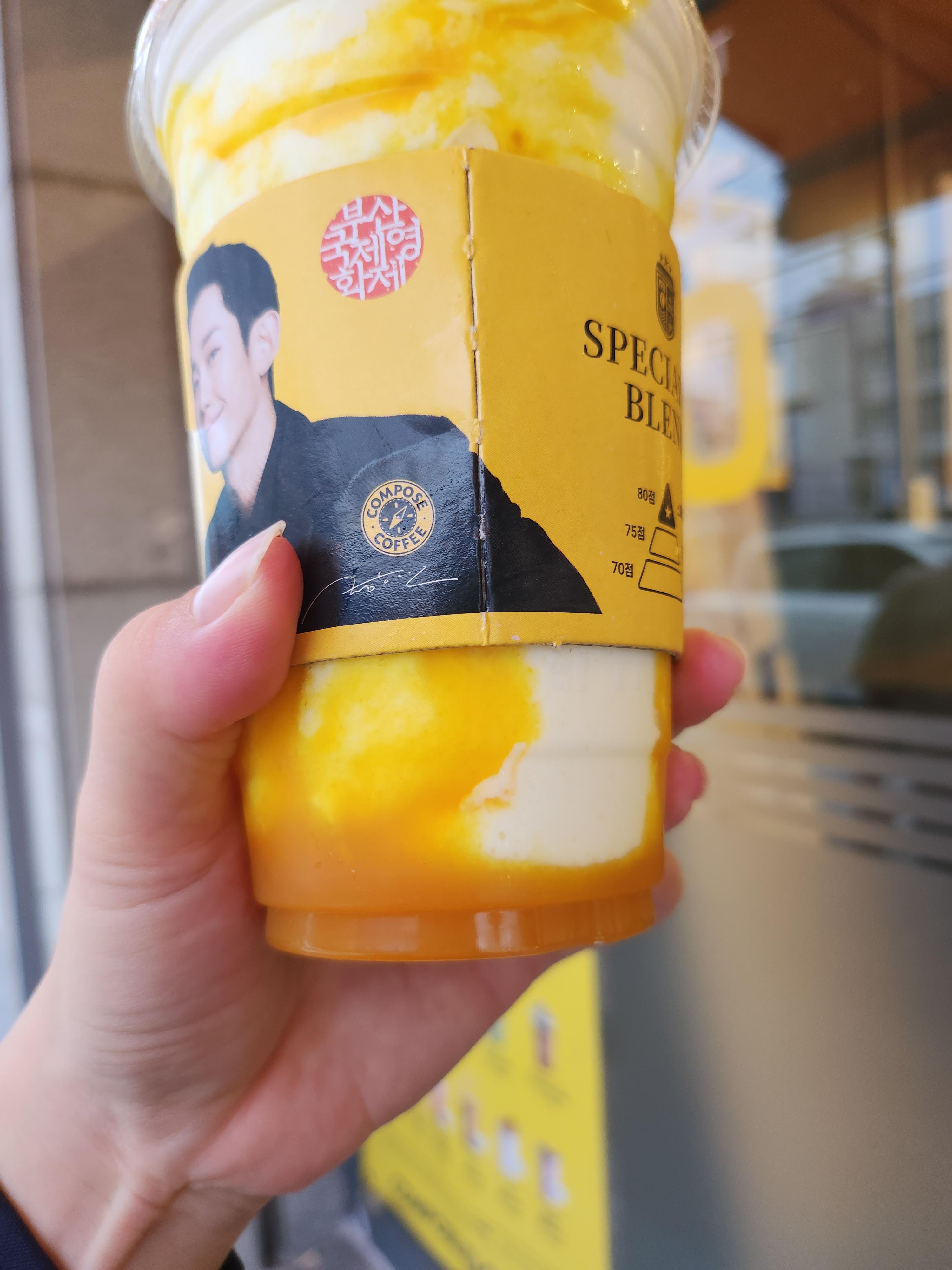 솔직히 맛 없을 수 없는 조합인 컴포즈 스위트콘 라떼, 컵홀더와 모델이 정해인이라서 너무 훈훈하고 좋아요. 컴포즈 스위트콘 밀크쉐이크의 칼로리는 약 500kcal 대이고요, 저는 보통 하나는 다 먹으면 너무 배부르기에 남편이랑 둘이서 나눠먹으며 산책을 한답니다.