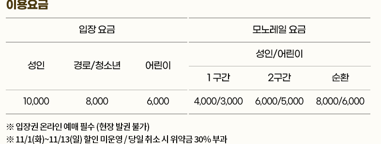 이용요금은 봄부터 가을은 성인 1만원, 어린이 6천원이며 겨울은 일반 1만원, 어린이 8천원으로 가격이 상이한데요. 겨울에는 모노레일 탑승권이 포함되어 있고 봄~가을은 모노레일 탑승권은 별도로 현장에서 선착순 구매를 해야합니다. 어린이 기준은 24개월 이상부터 초등학생 이하까지이니 참고해주시면 좋겠습니다.