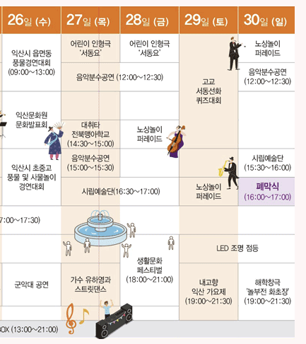 10월 21일부터 시작되어 30일까지 진행되는 긴 축제일정이다보니 프로그램도 다양합니다. 포스팅을 작성하는 25일 이후, 26일부터 30일까지의 마지막주 일정을 살펴보면 풍물경연대회, 문화발표회, 군악대 공연, 노상놀이 퍼레이드, 어린이 인형극, 생활문화 페스티벌, 퀴즈대회가 있습니다.