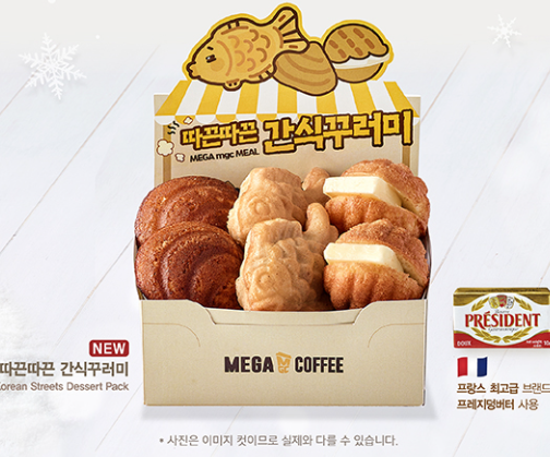 메가커피 간식꾸러미는 이름부터가 너무 귀엽습니다. 겨울이면 생각나는 붕어빵, 초코조개빵, 앙버터호두과자로 구성이 되어있는 구성인데요. 한데 모아 6ea를 판매하는 꾸러미는 프레지덩 버터가 들어가있어 맛과 풍미가 일품일것으로 예상됩니다. 메가커피 브랜드에서 재료에 신경을 많이 쓰는 모습이라서 이미지가 꽤 좋더라고요. 메가커피 간식꾸러미 가격은 3,500원입니다. 개당 600원정도 꼴이 되겠네요.