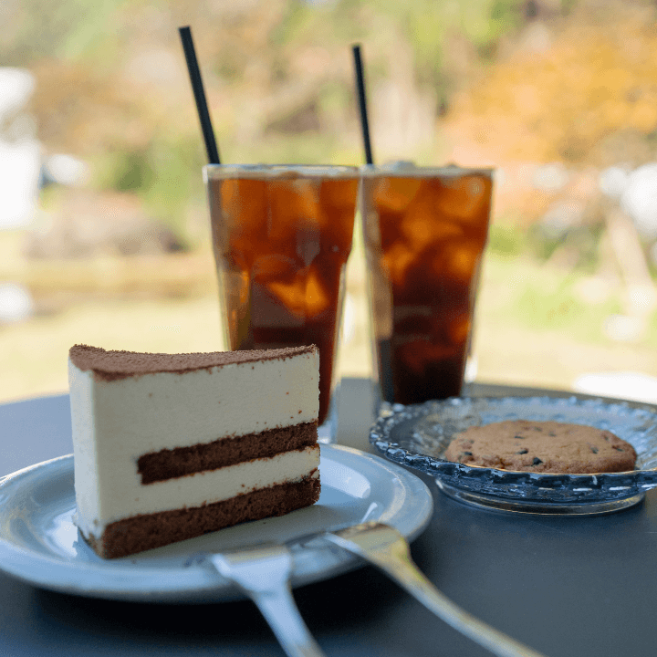 테라스에 앉아서 보는 뷰에서 사진도 많이 찍고 커피와 쿠키, 티라미수 케이크를 즐겼습니다. 참 카페 가기 좋은 날이라는 생각이 들 정도였는데요, 눈앞에 펼쳐지는 하늘과 붉게 노랗게 물든 경치를 감상하며 이야기도 나누고, 단풍을 구경했던 통도사에서의 시간을 떠올리며 힐링하는 시간을 가졌습니다.