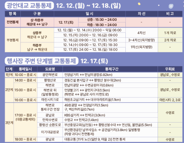 오후 5시부터는 수영로 해변로 통제구간을 연장하고, 광남로, 민락수변로, 황령산 순환도로, 이기대공원로, 광남로 모두 통제가 됩니다. 따라서 왠만함녀 12월 17일 축제 당일에는 차량운행을 자제하세요.