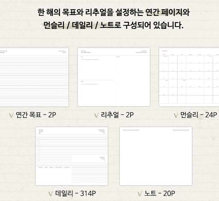 연간목표, 리추얼, 먼슬리, 데일리, 노트로 알차게 구성되어있는 2023년 스타벅스 다이어리 구성입니다. 데일리 구성말고 흰색 바탕으로 되어있는 라이프 저널 테마는 130x210mm 으로 사이즈는 같지만 144페이지로 페이지수가 적습니다.