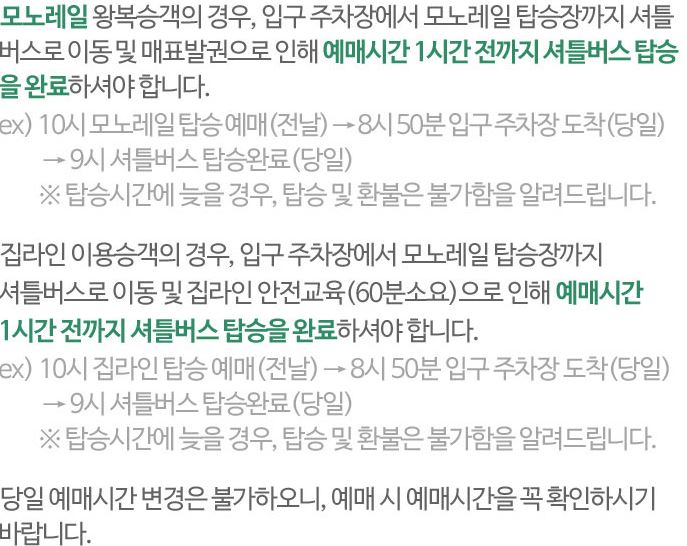 - 기상악화, 긴급점검 등으로 운행중단될 수 있음 (이 때는 100% 환불가능)