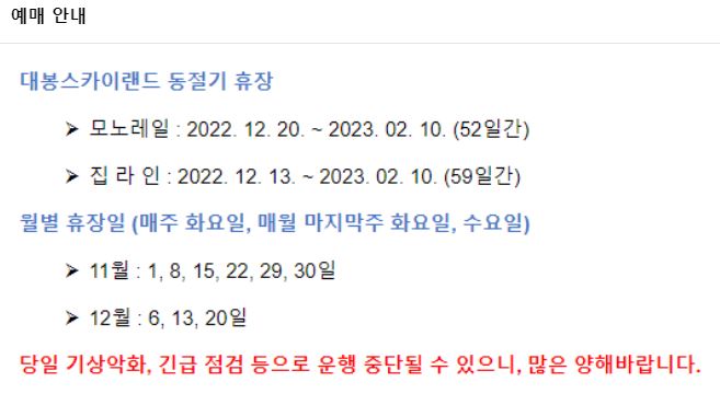 - 운행기간 2022년 2월 3일부터 2022년 12월 26일까지 대봉모노레일과 집라인은 오전 9시30분부터 오후 4시까지 운행합니다.
