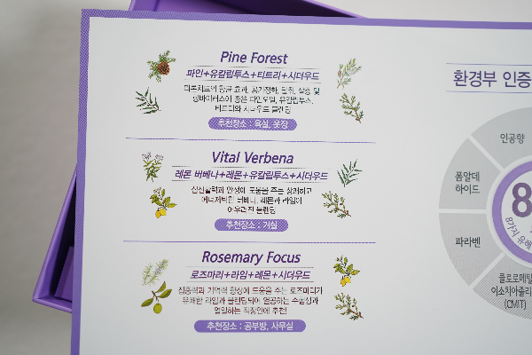 - 로즈마리 라임, 레몬, 시더우드 : 라임과 로즈마리가 집중력과 기억력을 높이는데 도움을 주어 공부방에 적합