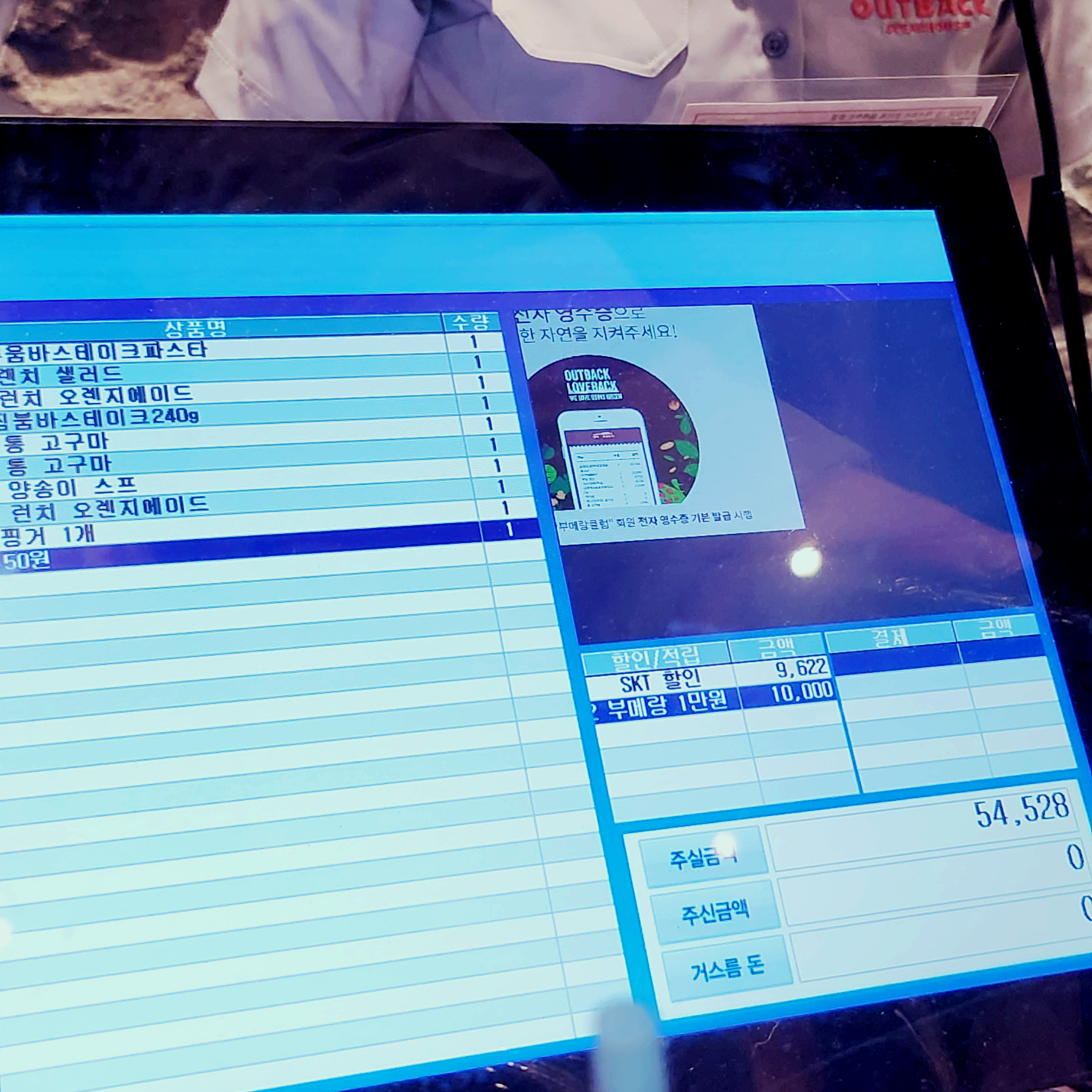 그 전에, 아웃백 어플리케이션을 설치하고 로그인 하면 쿠폰 3종을 받을 수 있는데 부메랑쿠폰으로 1만원 할인쿠폰을 받을 수 있었습니다. 1만원 할인이 먼저 적용되고, 통신사 할인이 적용이 됨으로 할인받기 전에는 약 74,000원의 금액이 나왔었는데 적용하니 54,000원대로 계산을 할 수가 있었답니다. 2인에서 한 끼 식사로 스테이크하우스에서 기분내기엔 꽤나 괜찮았던 금액인 것 같기도 합니다.