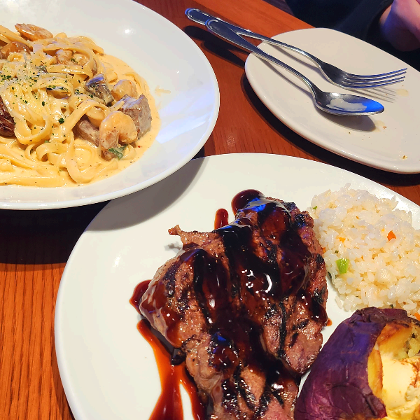 여기에 에이드 종류 하나 고르고, 디저트는 아메리카노와 녹차 중 고를 수 있는데 저희는 아메리카노까지 포장해서 한 끼 맛있게 즐겼습니다. 가성비 좋은 아웃백메뉴로 저희가 주문한 짐붐바스테이크와 투움바파스타의 조합을 추천드릴게요.