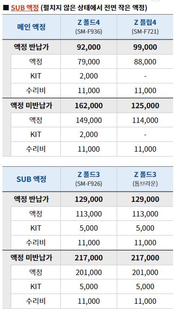 SUB액정은 펼치지 않은 상태에서 전면 작은 액정을 의미하는데, Z폴드4는 액정반납가는 92,000원이고 Z플립4는 99,000원입니다. 저는 힌지 부분은 수평이나 앞면이 쩌억하고 갈라진 모습이였고, 액정수리비 380,000원을 예상했습니다.