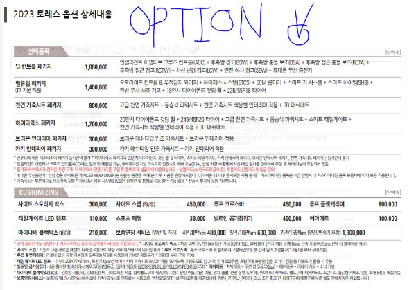 티볼리 이후 그렇다할 히트작이 없다가 쌍용에서 토레스가 나온 이후 판매율이 꾸준히 우상향하고 있다고 합니다. 길어지는 대기시간이 이를 증명하는데요. 2023년 토레스 가격은 T5등급은 2,740만원입니다. 옵션으로 썬루프 50만원, 4륜구동 200만원, 딥컨트롤패키지 100만원, 투톤익스테리어패키지 40만원, 사이드스텝 45만원을 추가할 수 있습니다.