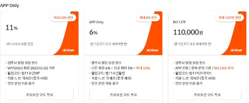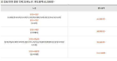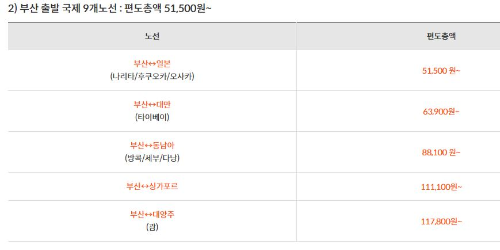 유류할증료와 공항이용료를 포함해서 83%까지 항공권할인이 된다는건 정말 끝판왕이 아닌가 싶습니다. 국내선은 편도 2만원부터 시작, 부산/인천/김포 출발하는 국제노선은 편도 5만원대 / 6만원대 / 8만원대 / 11만원대로 예매가 가능합니다.