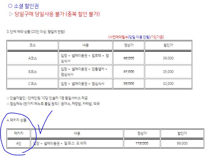 - 4인가족이면 입장, 썰매이용권, 알프스오색미 체험을 포함한 패키지를 99,000원에 이용해볼 수 있습니다