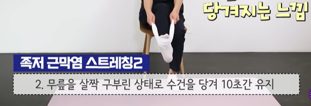 - 의자에앉아 수건을 아픈발바닥쪽에 대고 당긴다. 무릎은 살짝 구부려 아킬레스건을 느슨하게 해줍니다. 이 때 무릎을 일자로 펴서 다리전체에 자극을 줄 필요는 없습니다.