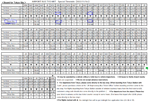 표에서 도쿄역, 긴자역 라인에 써져있는 시간은 그 시간에 도착한다는 의미입니다. 긴자역에 11시 20분에 도착하려면 터미널 1, 7번플랫폼에서는 9시 50분에 버스를 타야합니다.