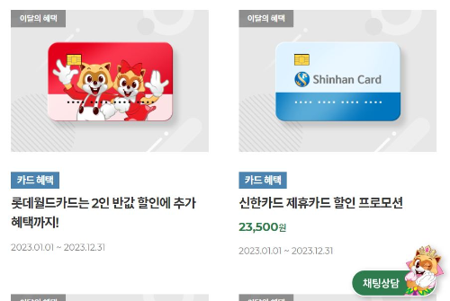 알아보니 월마다 혜택이 달라지는 편이더라고요. 우선 롯데월드 홈페이지에서 우대/혜택 > 이달의 혜택으로 가면 카드별 프로모션들이 있습니다.