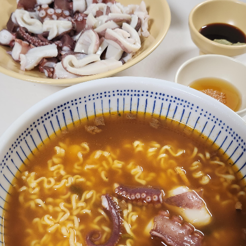 편마늘과 야채 살짝 준비해서 같이 곁들이니 정말 맛있고, 문어 데친물은 조금 따라두었다가 문어다리 몇개 넣어서 라면까지 끓였습니다.
