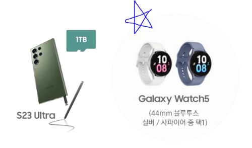 용량이 많이 필요해서 삼성닷컴에서 S23 울트라 1TB를 예약한다면, 갤럭시워치5를 무상증정하는 이벤트는 대박이네요. 44mm로 실버, 사파이어 중 받을 수 있는데 어차피 스마트워치를 사용할 것이라면 향상된 최고급라인의 사양인 삼성갤럭시s23울트라를 구매하면서 갤럭시워치5까지 받아보는것이 이득일 것 같습니다. S23 울트라 1TB는 삼성닷컴 전용모델입니다.