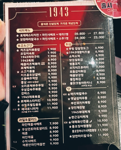 요즘 핫한 술집의 1943 메뉴판과 메뉴들을 한번 살펴보겠습니다. 메뉴도 다양하고 엄청 많은 편인데요, 음식은 신념있게 가격은 개념있게 라는 슬로건으로 가격도 저렴합니다.
