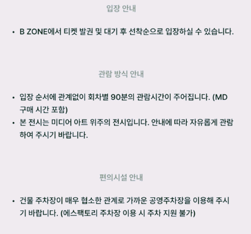 입장순서에 상관없이 회차별 90분 관람시간이 주어집니다. (MD 구매시간 포함) 미디어 아트 위주의 NCT HOME 전시회 이기 때문에 자유롭게 관람하면 되는게 무척 좋네요. 티켓은 현장에서 수령합니다. 꼭 신분증을 지참해주세요~