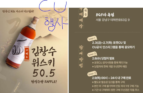 하지만 원소주, 김창수위스키와 같이 적은 물량으로 한정판 마케팅을 하는경우 그 경쟁이 정말 치열한데요. GS25의 흥행에 힘입어 홈플러스 및 CU편의점에서도 김창수위스키를 소량입고하여 행사를 진행합니다.
