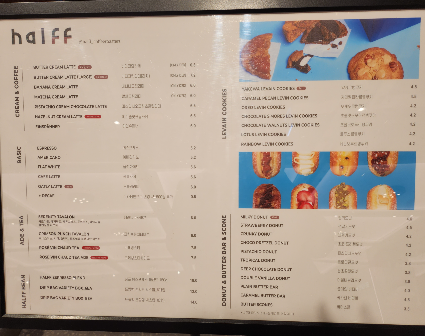 생각보다 도넛과 쿠키 종류가 많았고 도넛이 은근히 저렴하더라고요. 크림이 빵빵하게 들어있는 소시지핫도그 모양인데, 토핑도 가득 올라가있고 맛있어보여서 가장 기본으로 보이는 하프커피도넛도 주문했습니다. 그리고 처음보는 약과르뱅쿠키, 이게 베스트 메뉴라고해서 또 하나 주문을하고요. 버터크림라떼 한잔에 쿠키 하나, 도넛 하나 15,000원이면 하프커피 센텀 가격 괜찮네요.
