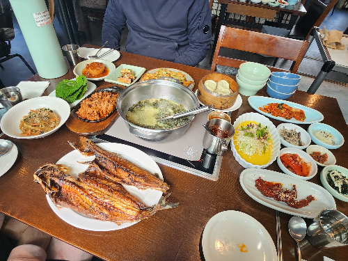 밥은 솥통을 들고오셔서 사장님께서 곤드레밥으로 준비해주시고, 생선구이와 만두, 무조림, 샐러드, 제육볶음, 전, 미역국, 잡채, 새우장 등 여러 반찬들이 상에 한가득 차려지는데요.
