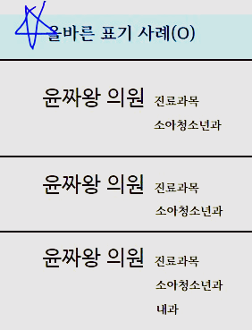 - 일반의와 전문의 모두 전공과목 외 과목을 진료할 수 있고, 의원 고유명칭 뒤에 작은 글씨로 진료보는 과목을 표기해야 합니다.