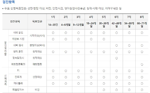- 4개월, 9개월, 18개월, 30개월, 42개월, 54개월, 66개월까지 총 7회 월령별 건간겅짐을 시행합니다.