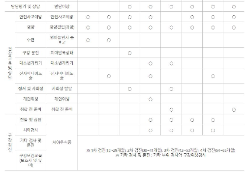 - 성장발달, 비만, 치아우식증, 영아돌연사증후군, 청각검사, 시각이상검사, 안전사고 등을 선별합니다.