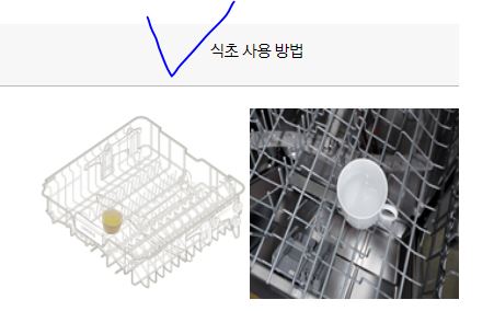 - 식기세척기 상단 트레이에 컵 하나를 세워두고, 안에 식초를 풀어서 내부세척코스를 돌린다.