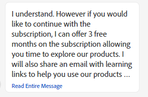 4. 왜 해지하려고 하냐, 무엇이 부족했냐 등 디테일을 물어봅니다. 여기서 어도비는 한 가지 제안을 합니다. 그럼 3개월 무료로 연장해줄게! "너는 1년에 약 72,000원의 혜택을 공짜로 누리는 거다"라고 합니다.