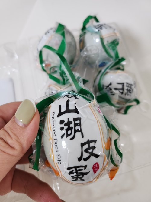 흙 속에 묻어서 두 달 정도 삭힌다고 하는데 구매한 피단을 보니 딱 두달 전에 만들어졌더라고요. 홍어를 삭히면 암모니아 향이 확 올라오는 것처럼 송화단 역시 노른자 냄새가 압권입니다.
