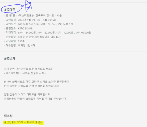 1인당 4매가 구매가능하며, 서울에서 일정만 4회차*3일이니 12회가 되네요. 아마도 지방은 하루-이틀이 되지 않을까 싶은데요. 대한민국을 트롯 열풍으로 빠뜨린 주연들을 실물로 볼 생각에 무척 설레일 것 같아요. 최종 캐스팅은 결선진출자 7명과 화제의 출연자가 전국을 함께 돈다고 하네요.