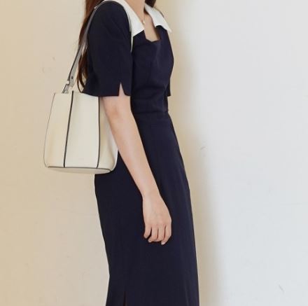 가장 기본적인 결혼식 하객룩이 아닐까 싶은데요, 검정색/네이비 등으로 차분한 색상에다 카라나 소매 부분 등 흰색의 포인트가 있는 옷이 은근히 돋보입니다. 가방의 색도 밝은색, 유채색으로 들어주면 훨씬 돋보이고 흰색, 검정색처럼 무채색으로 메어주면 단정하고 정돈된 느낌이 가장 많이 드는 원피스 코디입니다.