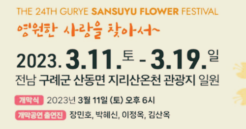 3월 8일부터 산수유 개화는 어느정도 시작이 되었습니다. 코로나로 인해 중단되었던 산수유축제는 4년만에 열리게 되었습니다! 2023년 제24회 구례 산수유축제가 지리산온천관광지 일원에서 열리며, 장소는 전남 구례군 산동면 좌사리 839-6입니다. 본격적으로 구례 산수유축제 일정 및 기간은 3월 11일부터 3월 19일까지입니다.