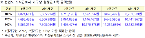 - 전년도 도시근로자 가구당 월평균소득의 120% 이하 (배우자 소득 있는 경우 140% 이하)