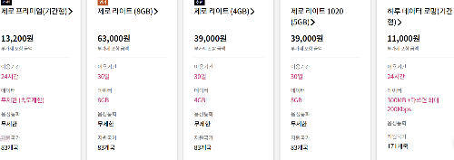 나라를 설정하면 이용가능한 로밍 상품을 바로 확인해볼 수 있습니다.