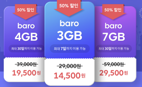 로밍가격은 50% 혜택적용 시 3GB 14,500원 / 4GB 19,500원 / 7GB 29,500원입니다.