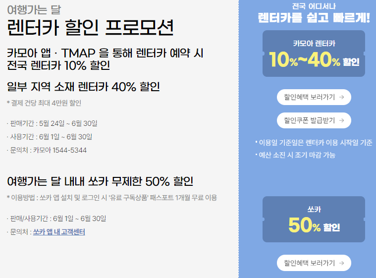 6월 한달 간 이용할 수 있는 교통, 숙박, 테마파크 할인혜택 역시 준비되어 있습니다.