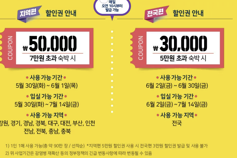 5월 30일부터 6월 1일까지 진행되는 기간동안에는 12개의 광역시, 도 내 숙박시설 대상으로 7만원 초과 숙박상품 구매시 5만원 할인권 제공합니다.