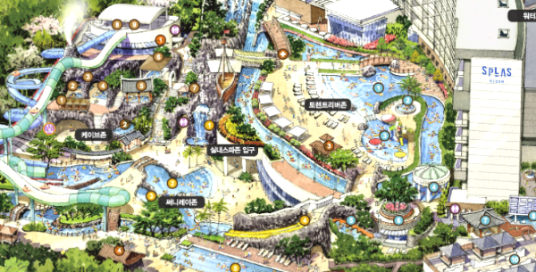 - 케이브존 - 닥터피쉬스파, 와인스파, 구명조끼대여소, 마스터블라스터, 튜브슬라이드 등의 어트랙션