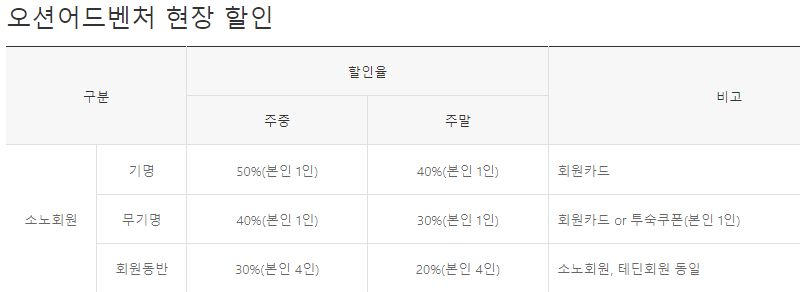 천안 소노벨 워터파크 오션어드벤처 현장 할인이 있습니다. 소노회원이라면 기명, 무기명, 회원동반에 따라 할인율이 달라집니다. 할인 받으면 실제로 결제하는 금액은 위 금액보다 좀 더 저렴하지요.