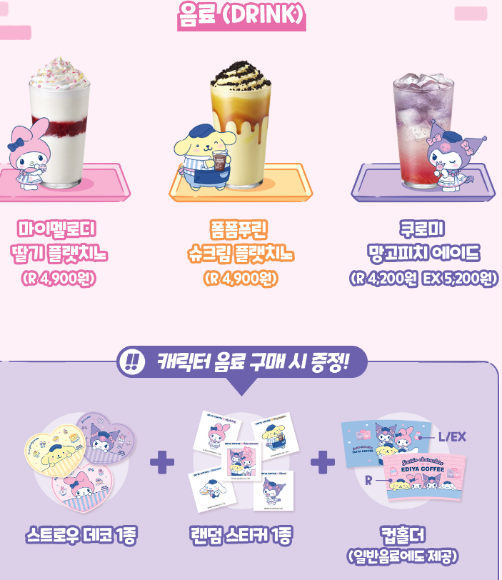 산리오 콜라보 음료는 3종이 출시됩니다. 캐릭터 음료를 구매할 시 스트로우 데코 1종, 랜덤 스티커 1종, 컵홀더가 제공됩니다. 익숙한 음료이지만 산리오 캐릭터들이 옆에 있으니 더 먹음직스러워 보이네요.