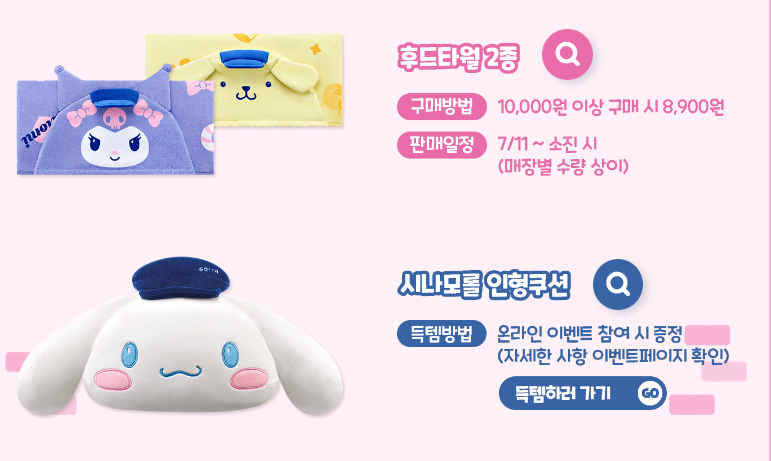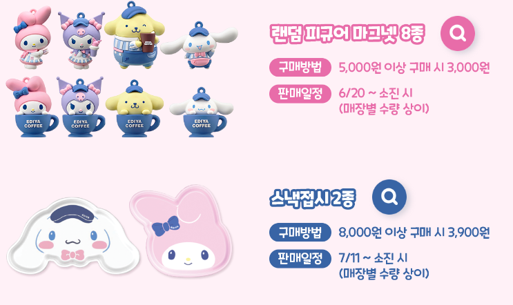 7월까지 총 3회차까지 진행이되는데, 랜덤피규어 마그넷, 스낵접시, 후드타월 등에 참여를 해볼 수 있답니다. 산리오 굿즈들 역시 하나하나 너무 귀엽고 산리오 팬들의 마음을 사로잡을 것 같습니다.