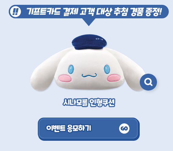 최소 2만원이상 구매하는 경우 구매자에게 전원 스티커세트를 증정하고, 기프트 카드를 통해서 결제하는 고객을 대상으로 시나모롤 인형쿠션 추첨을 진행합니다.