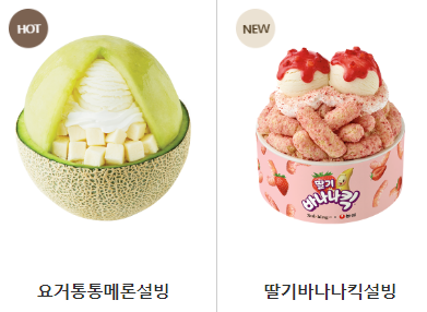 요거통통 메론설빙, 리얼통통 메론설빙, 딸기치즈메론설빙, 샤인머스캣메론설빙 등 메론이 주가 되는 설빙 신상 메뉴 여름빙수 입니다. 멜론 생과육이 직접 들어가기 때문에 가격은 좀 비싸지만, 연유와 어우러져 단맛이 일품인데요.
