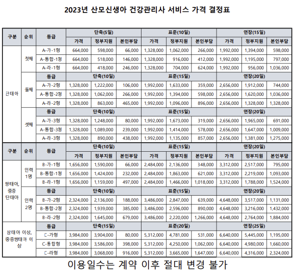 대개 10일이면 평일기준 2주 인데요. 이 경우 단태아 -첫째의 경우 정부지원 산후도우미 비용 본인부담금이 266,000원 / 412,000원 / 624,000원으로 비교적 부담이 적은 편입니다.