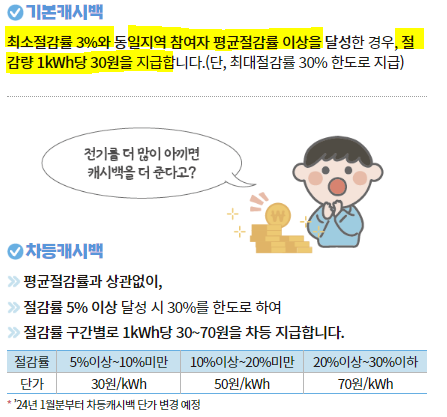 - 절감률 30%를 한도로 1kWh당 30~70원의 캐시백을 차등으로 추가 지급하는 제도