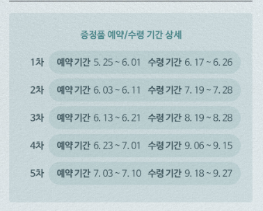 - 예약차수별 수령기간 및 증정품 수령 매장, 영업시간을 반드시 확인해야 합니다.