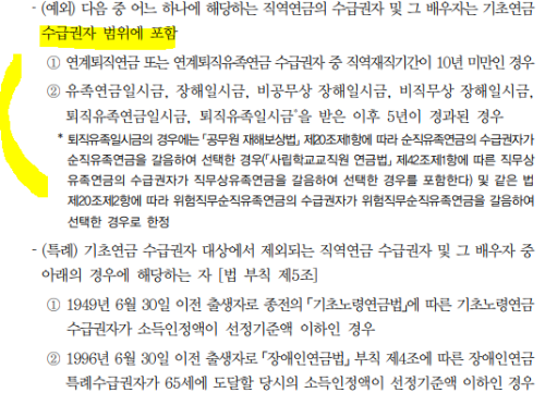 - 공무원, 사립학교 교직원, 군인, 별정우체국직원 등 직역연금의 수급권자와 그 배우자는 기초연금 대상 제외